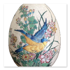 L'oeuf apparaît comme un des symboles de la rénovation périodique de la nature : tradition de l'oeuf de pâques, des oeufs colorés, dans de nombreux pays. Il illustre le mythe de la création périodique. Nos oeufs s’inscrivent dans la ligne artistique classique de Longwy de la fin du XIXème siècle qui a fait sa renommée. Fleurs, oiseaux et paysages composent un décor harmonieux, matérialisé par le cerne noir dessiné sur le biscuit de faïence. L’émail de différentes couleurs est apporté au goute à goutte avec précision. Le décor émaillé sera alors sublimé par l’apport de touches de pinceau sur chacun des éléments composant le décor afin de lui donner profondeur, finesse et relief.